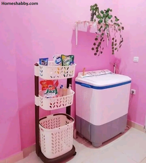 View interior laundry room ini sangat menarik untuk membuat kegiatan cuci baju jadi menyenangkan. Warna pink jelas mendominasi satu ruang ini dengan simple dan sederhana. Khusu untuk tempat cuci baju, anda bisa menggunakan perabot tambahan untuk tempat baju kotor sekaligus tempat sabun cuci dan pewangi.