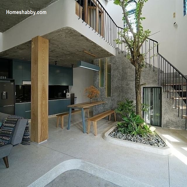 Area interior rumah 60 meter persegi ini mengenakan konsep terbuka. Sehingga akan membuat ruangan dalam rumah terasa lebih luas dan lapang. Tak hanya itu, dengan adanya taman dalam ruangan juga membantu rumah memiliki sirkulasi udara yang bagus dan akan membuat penghuni merasa nyaman dengan kondisi rumah industrial ini.