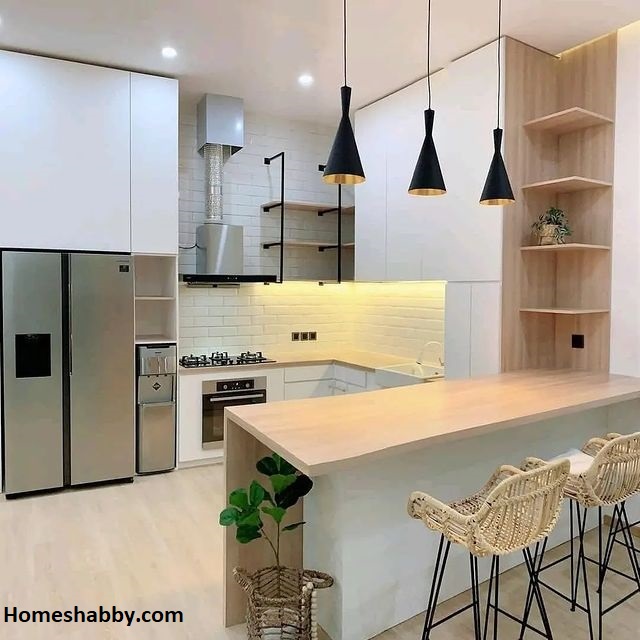 Ini merupakan detail bagian ruang dapur dengan bentuk L yang kompleks. Memiliki kabinet simpan dan juga rak terbuka sebagai tambahan. Dapur lebih modern dengan kompor freestanding juga lebih aman. Hidden lamp di aplikasikan supaya detail dapur semakin estetik menambah tampilan hangat dan semakin sempurna.